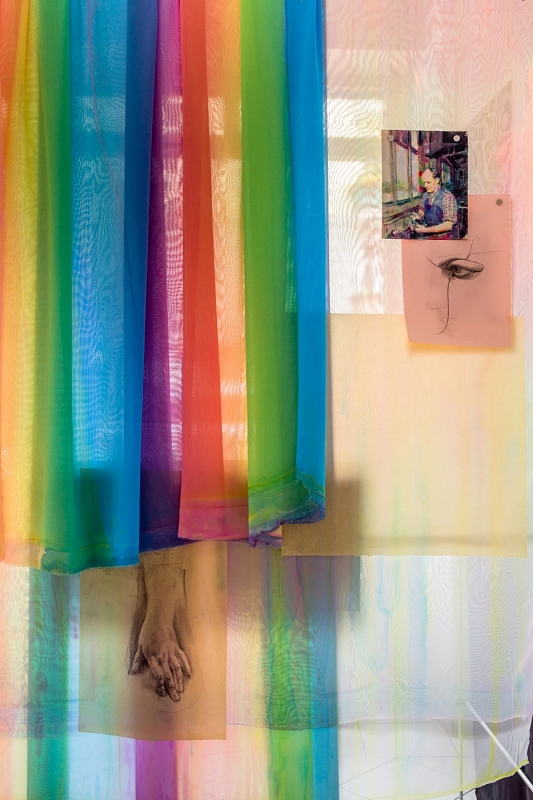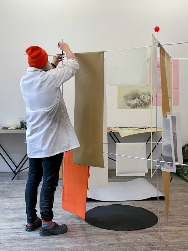 En installation i blandteknik med målningar, teckningar, målade textilier, oljade papper som hänger på metallrörskonstruktion.