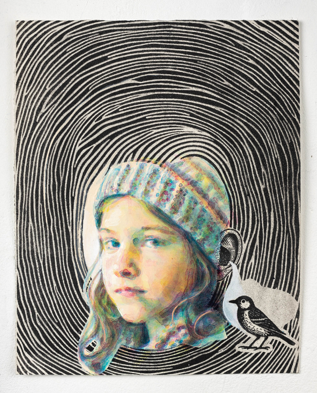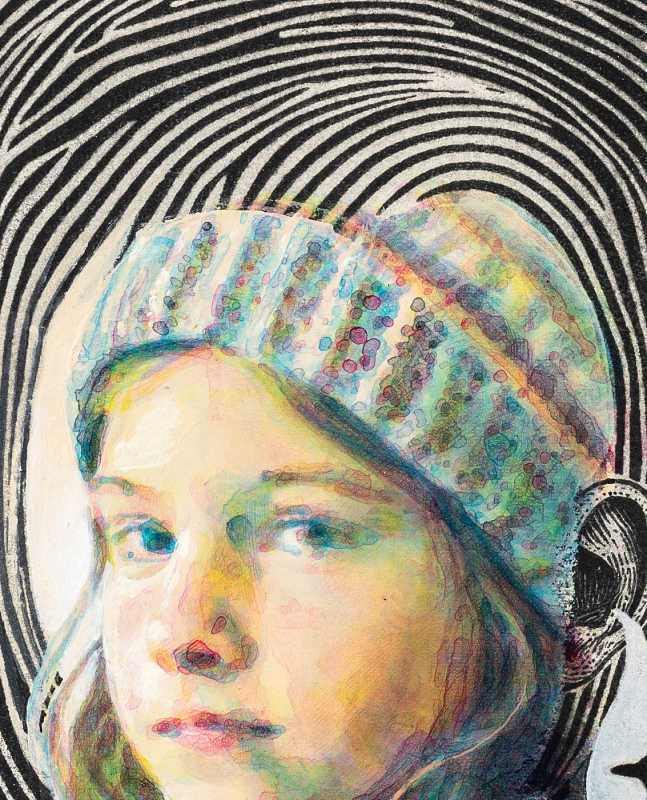 Från serien "Child's Gaze", 21 x 26 cm mixed media-målning: ansikte (akvarell/akryl), bakgrund (penna på svartvit litografi handtryckt på 100% bomullspapper)