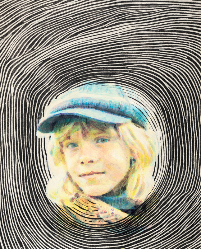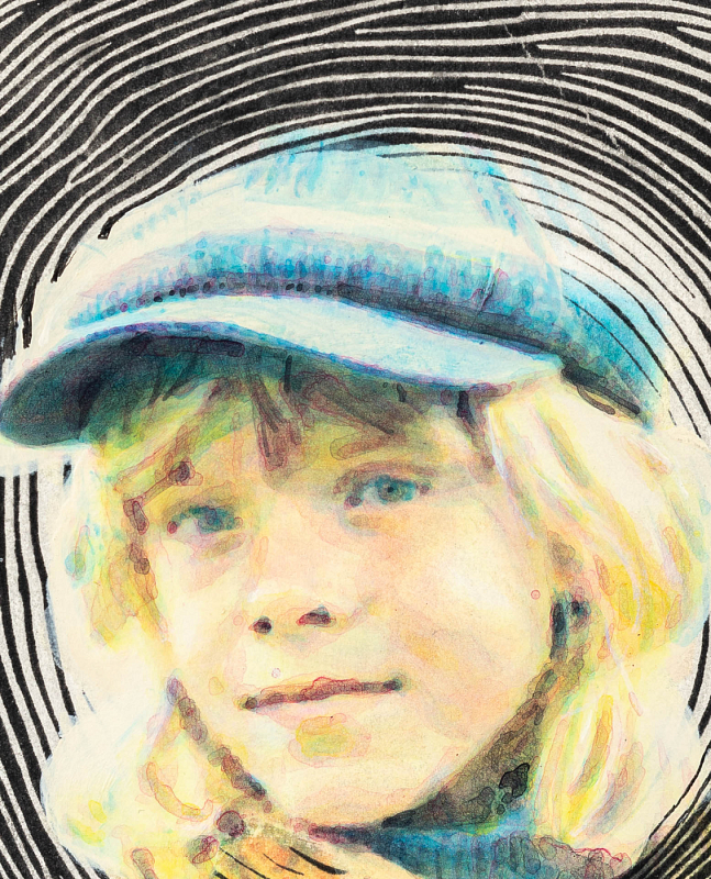 Från serien "Child's Gaze", 21 x 26 cm mixed media-målning: ansikte (akvarell/akryl), bakgrund (penna på svartvit litografi handtryckt på 100% bomullspapper)