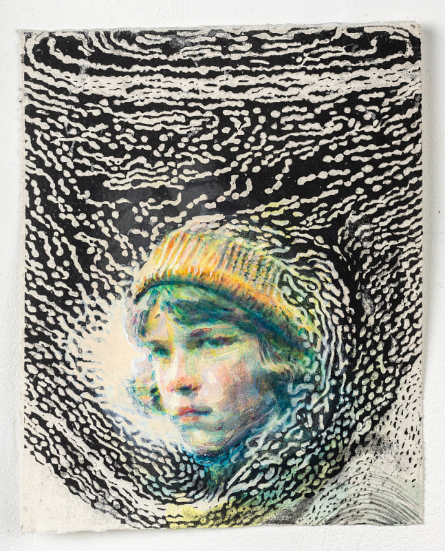 mixed media painting: face (watercolor/acrylic), background (pen on black and white lithograph handprinted on 100% cottonpaper)