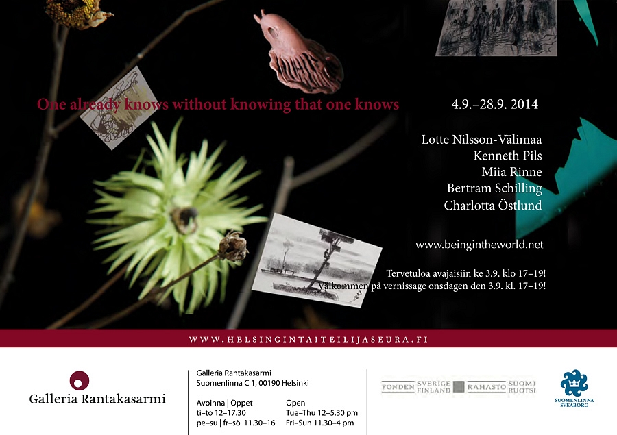 The exhibition is organized by the collective “Being in the world” [BITW]. This collaboration between visual artists, writers and theorists from different European countries was founded in Stockholm in 2012. It revolves around the topic of landscape in a wider meaning of the word, that is: to be in, look out on, relate to the world.