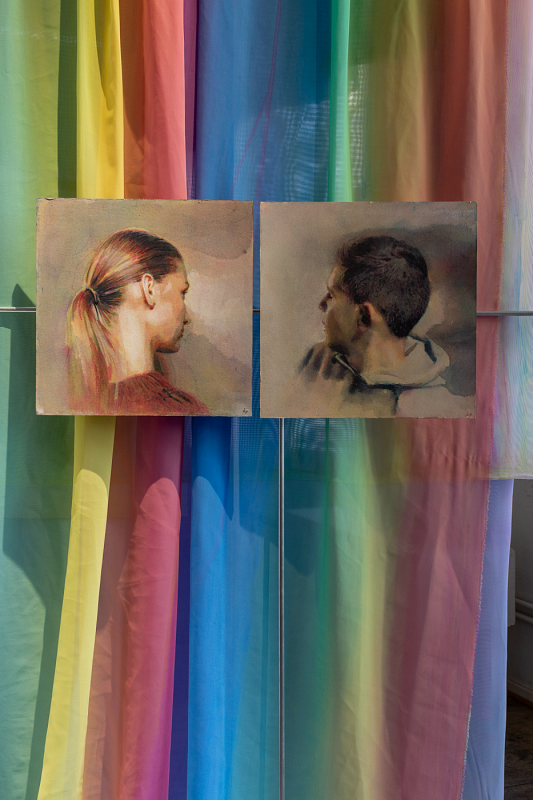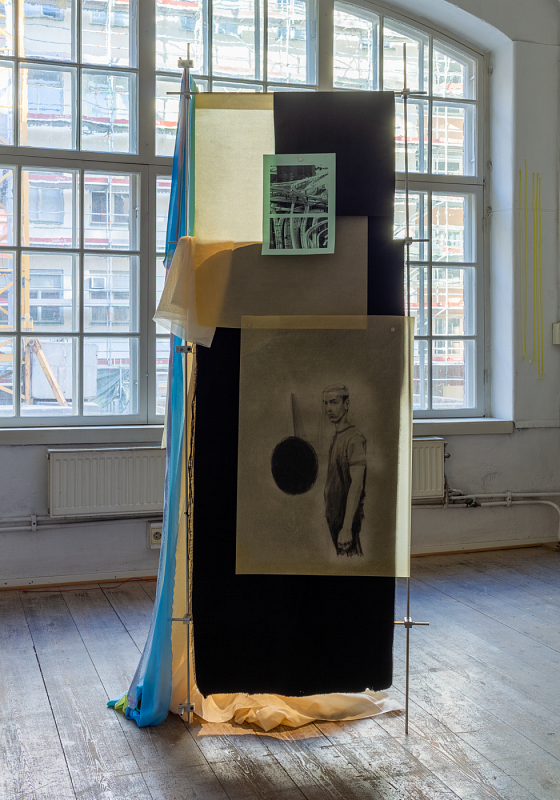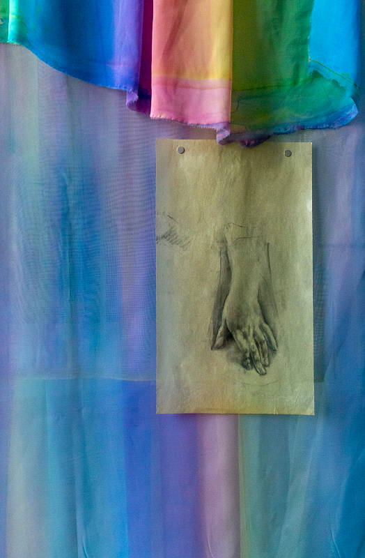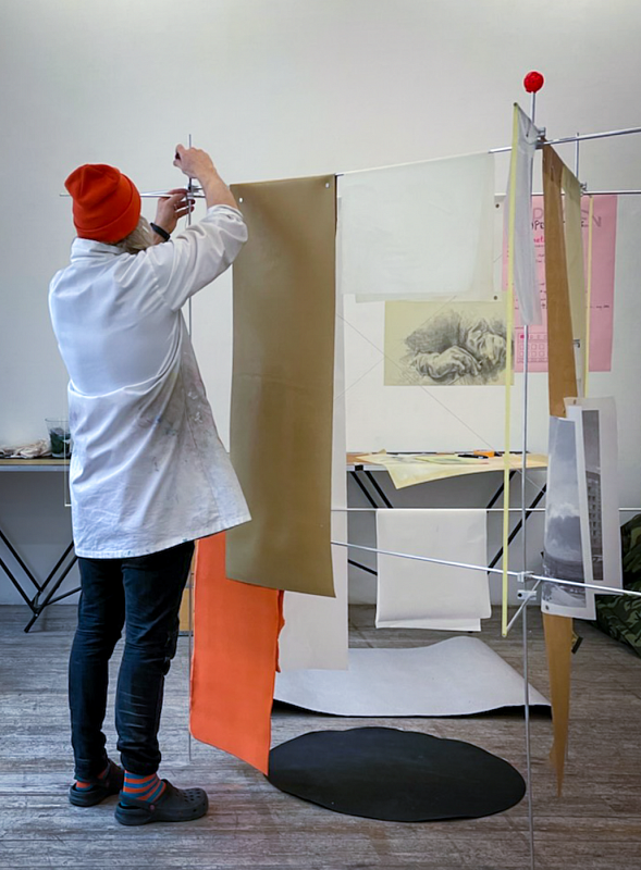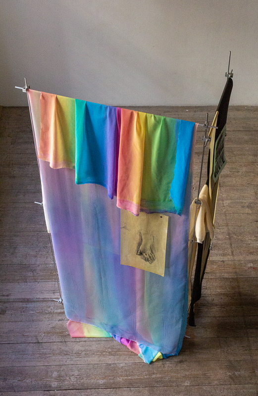Blandad mediainstallation med målningar, teckningar, målade textilier, oljade papper som hänger på metallrörskonstruktion.